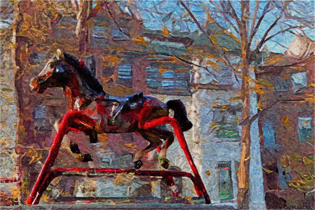 “Race Horse” captures the nostalgic charm of a 1970s spring-mounted playground horse, set against the backdrop of a quiet, urban streetscape. With thick, expressive brushstrokes and rich textures, the piece contrasts the playful energy of childhood with its elegant surroundings. The bold red frame pops against the soft tones of a tree-lined streetscape, inviting viewers to reflect on how icons of our youth, especially those tied to play and movement, occupy the quiet corners of our minds. A once-familiar toy becomes a vivid reminder of wonder, memory, and time.